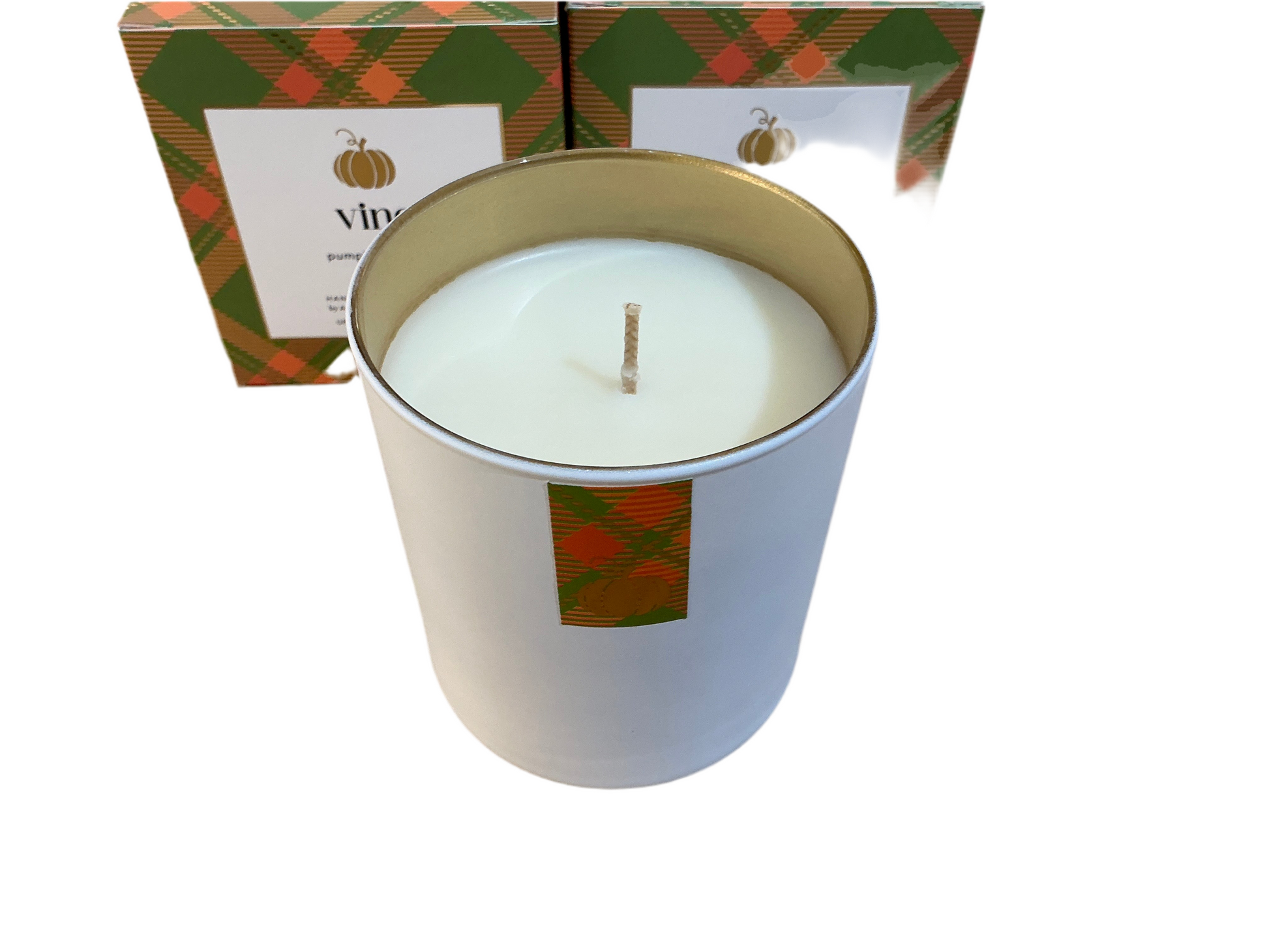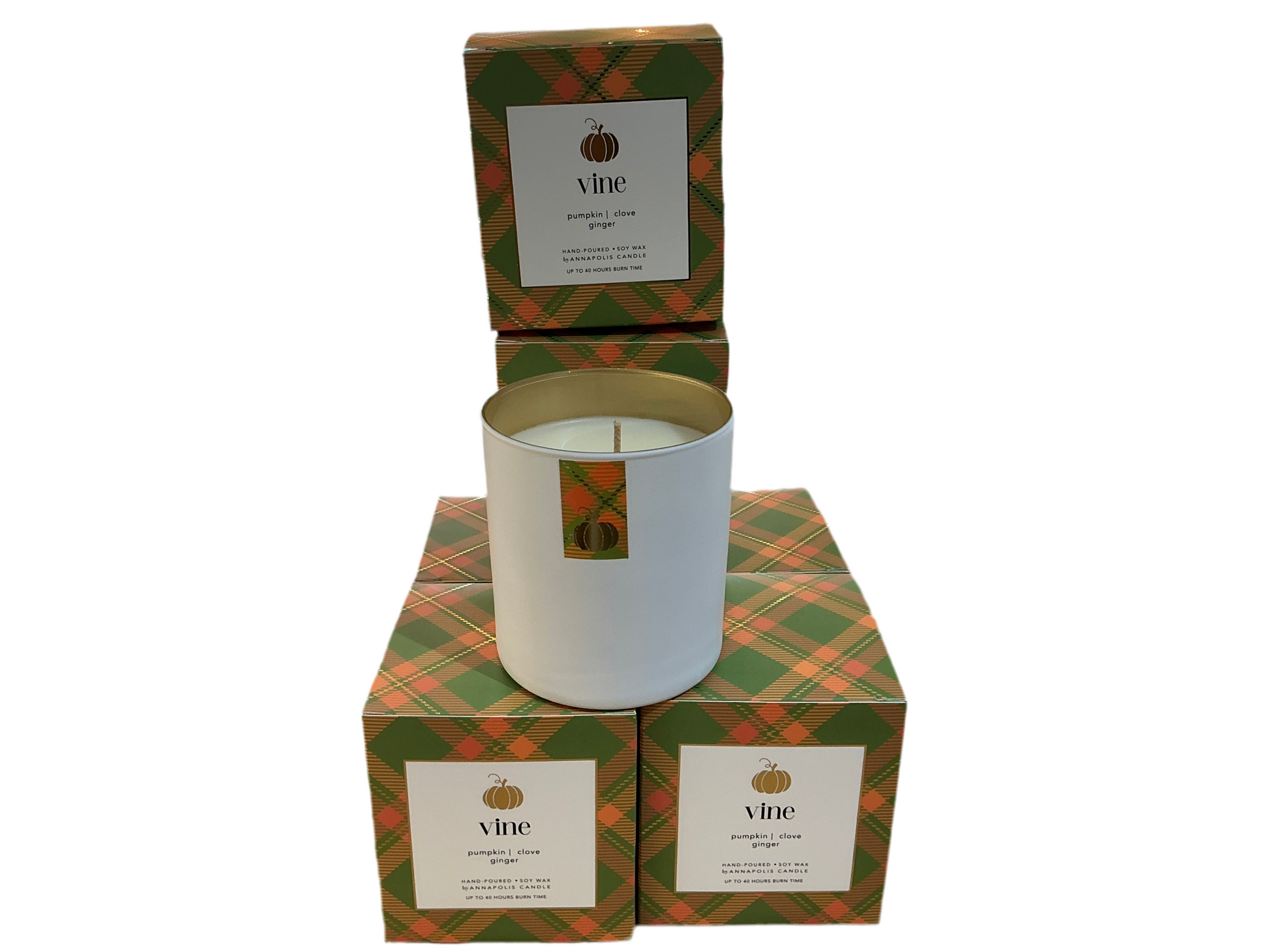 Fragrance notes include pumpkin, ginger and clove. 8oz, boxed soy-wax candle.