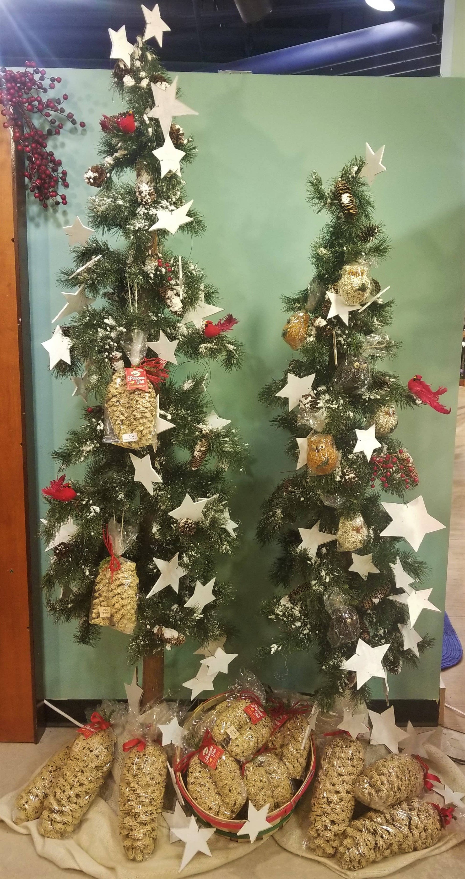 One very large natural sugar pine cone coated with premium birdseed. These cones are gathered by hand in the forests of Oregon. Presented in a clear bag with green garland and red raffia tie at the top. May be re-coated with suet, peanut butter, and seed.