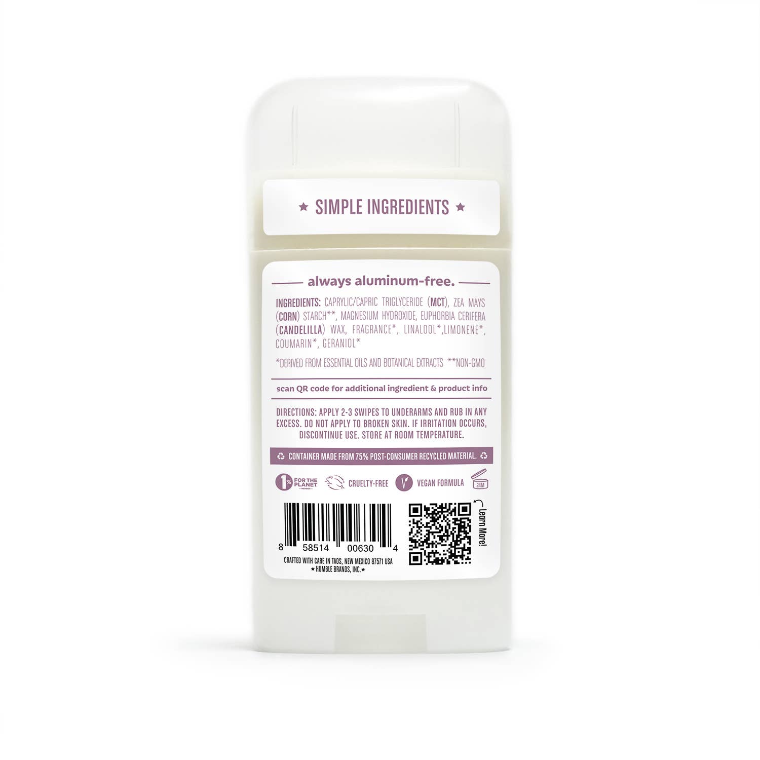 Product Description: Made with simple, highly effective ingredients (MCT oil, non-GMO corn starch, magnesium hydroxide, candelilla wax and botanically-based scents). Humble Brands Deodorant is formulated to absorb and neutralize body odor. A vegan friendly and baking-soda free formula, Humble Brands Deodorant has no aluminum, alcohol, dyes, parabens, sulfates or artificial fragrance. Certified Cruelty-Free by Leaping Bunny and a 1% for the Planet product that gives back with every purchase. Packaged in 75% post consumer recycled plastic.