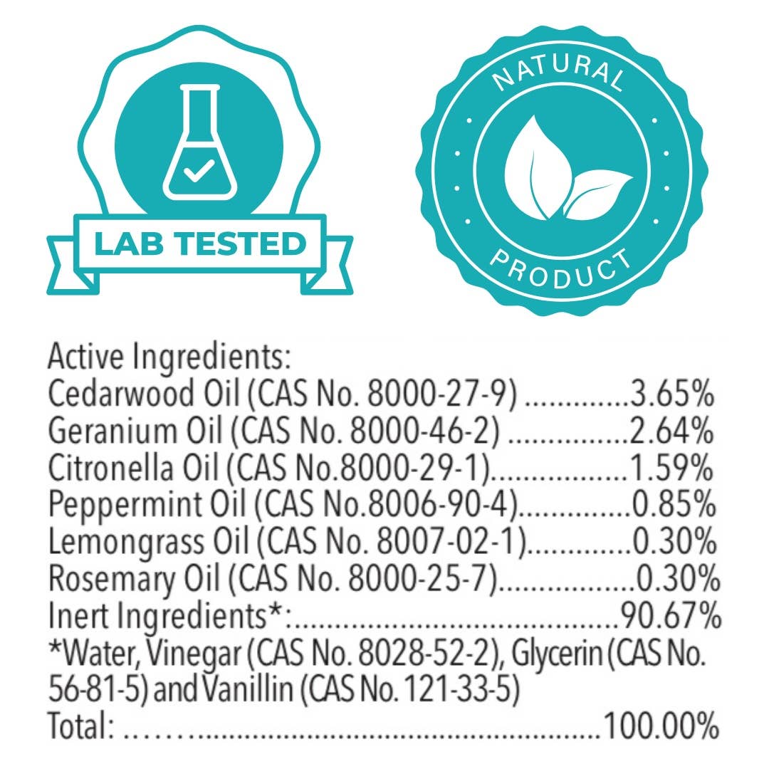 Cedarwood Oil, Geranium Oil, Citronella Oil, Peppermint Oil, Lemongrass Oil, Rosemary Oil, Water, White Vinegar, Vanillin, and Plant-Based Glycerin.
